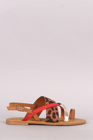 Bamboo Leopard Strappy Toe Ring Slingback Flat Sandal