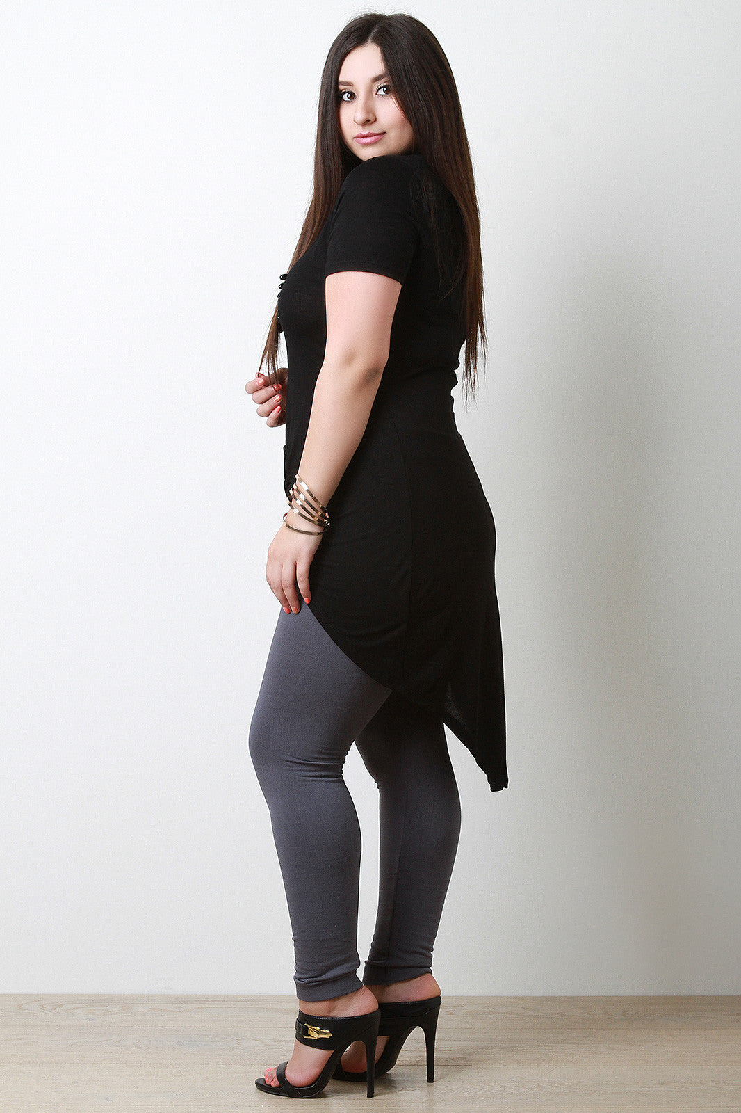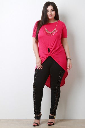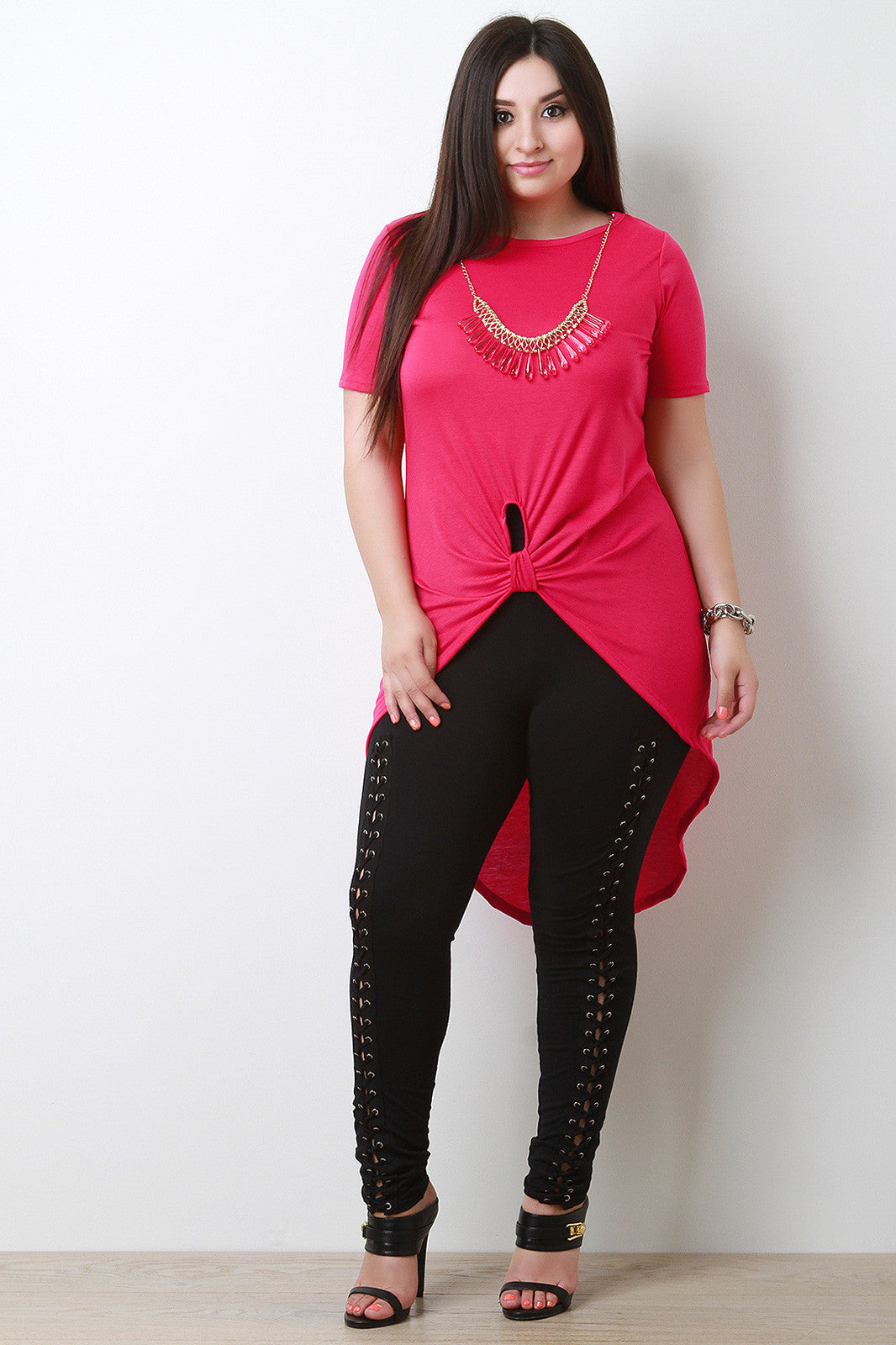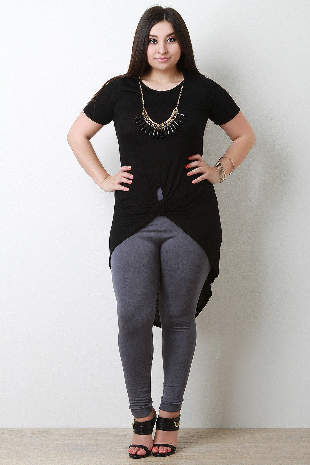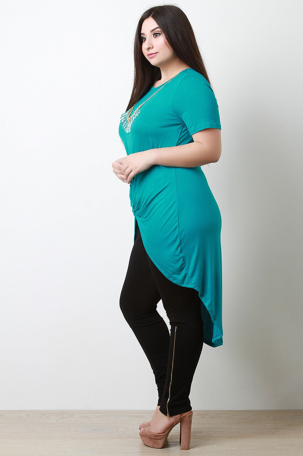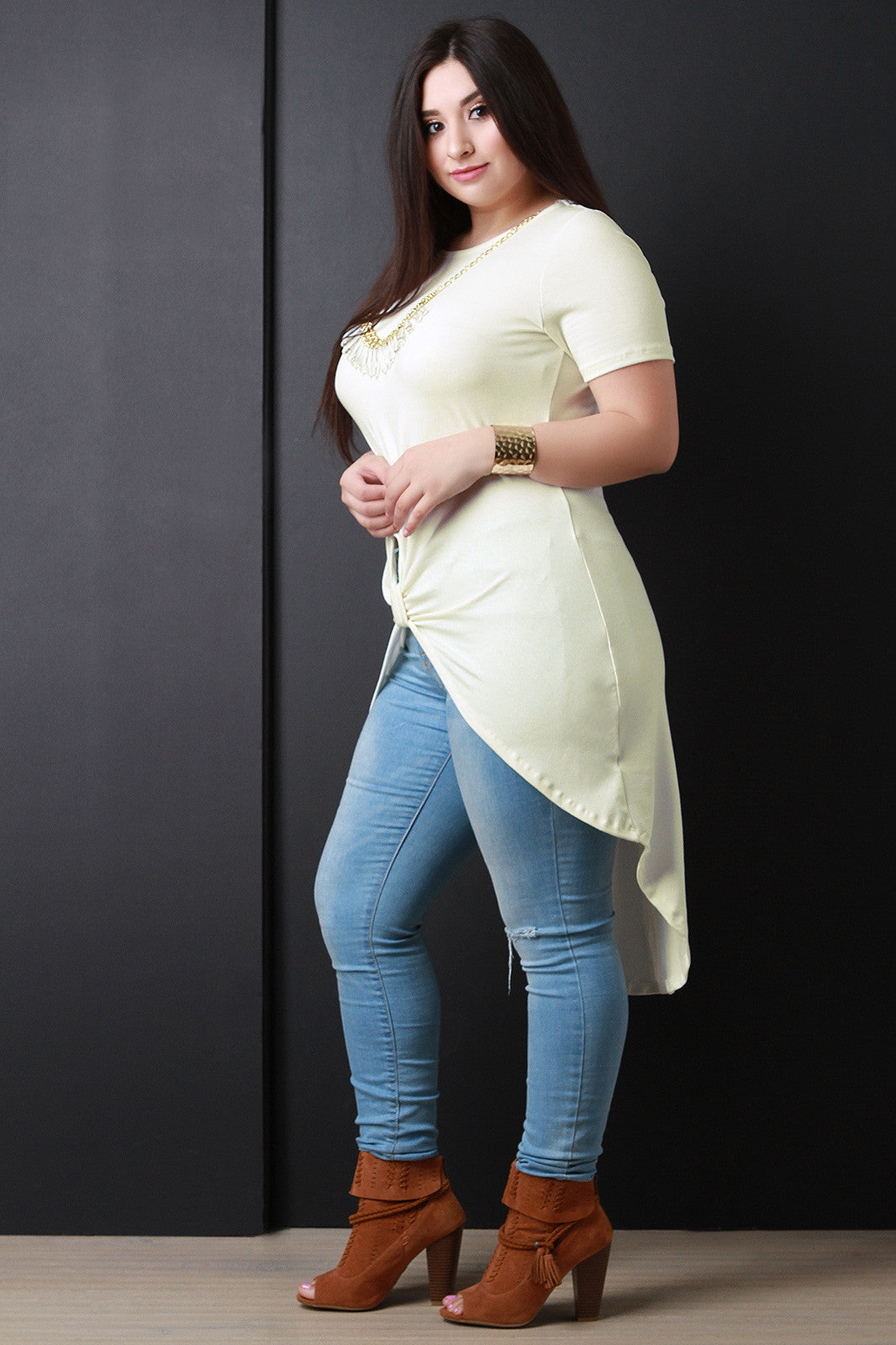 This casual plus size top features a jersey knit fabrication, round neckline, removable beaded necklace, short sleeves, and a front twist knot detail. Finished with a high-low maxi-length hemline. Accessories sold separately. Made in U.S.A. 95% Rayon, 5% Spandex.