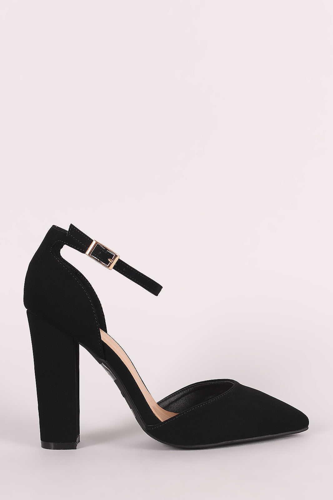 Bamboo Nubuck Pointy Toe Ankle Strap Chunky Heeled Pump