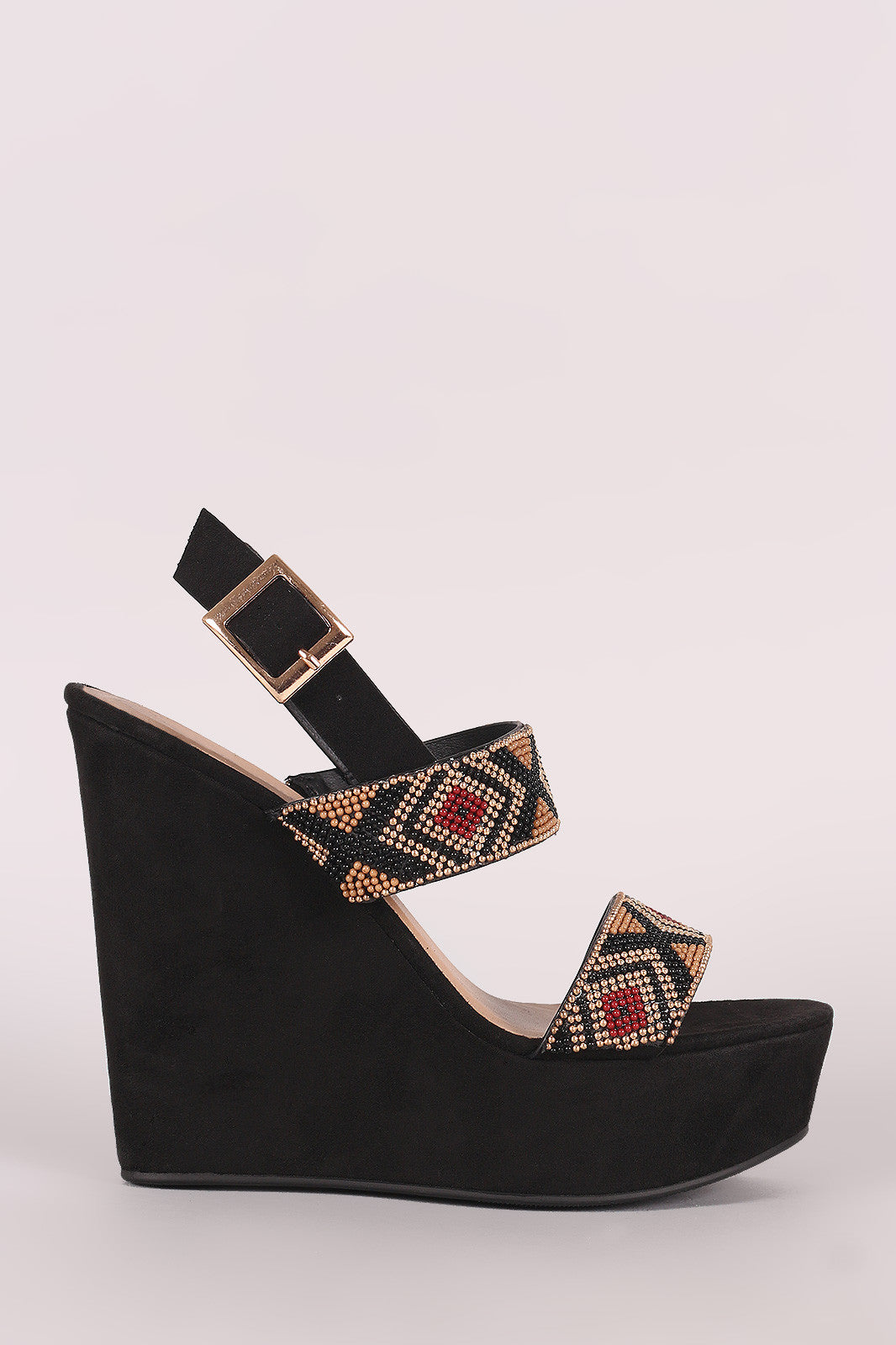 This wedge , features two straps across the front with an adjustable back strap. Detailed with tribal designed beads. Elevated on a platform.