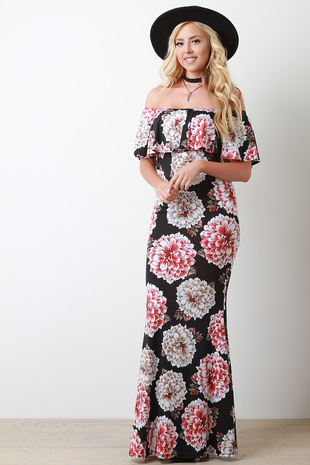 Zinnia Floral Print Ruffle Tiered Bardot Maxi Dress