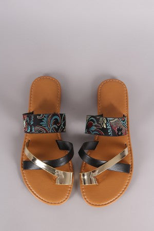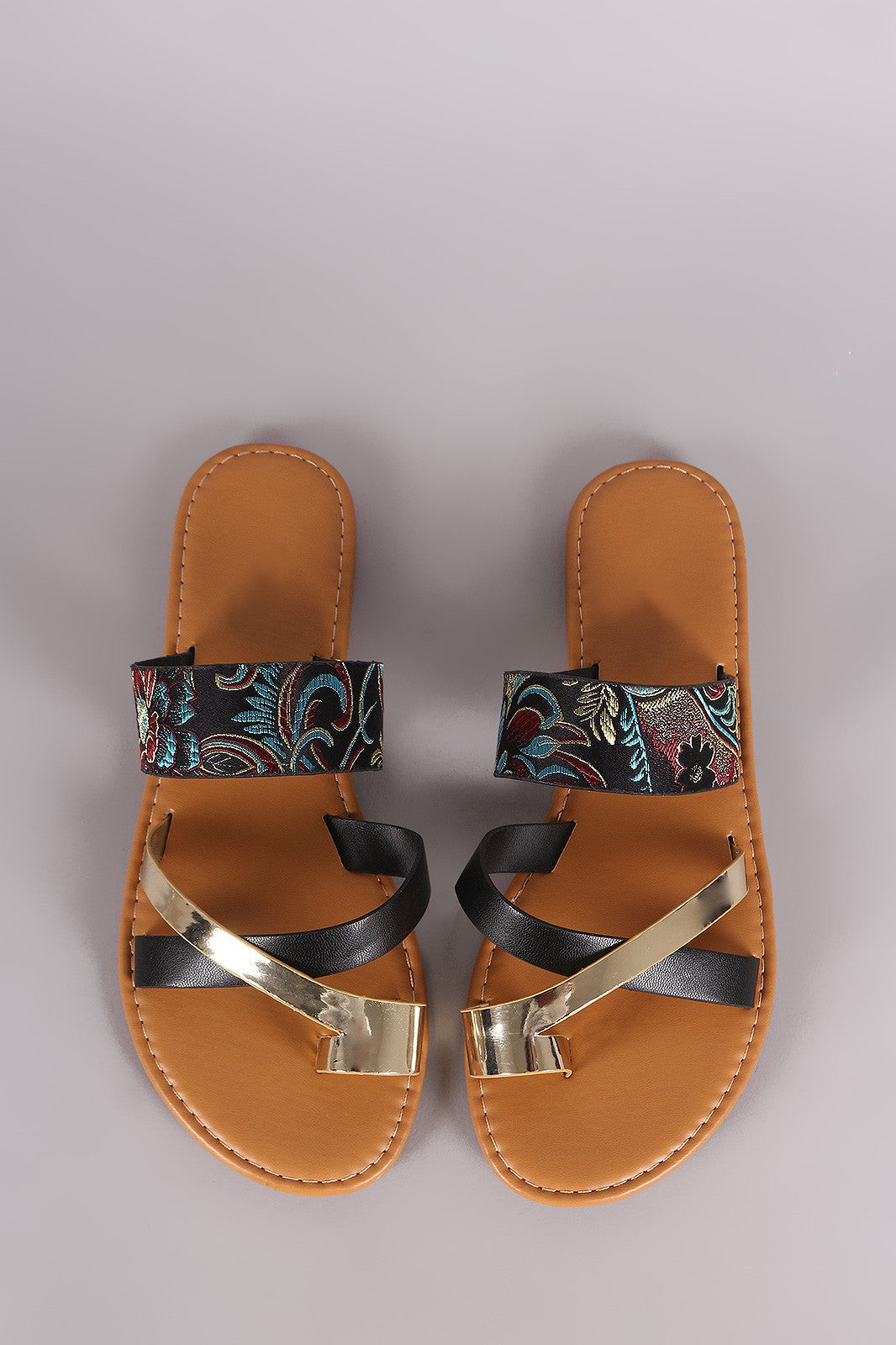 Bamboo Satin Embroidery Strappy Toe Ring Flat Slip On Sandal