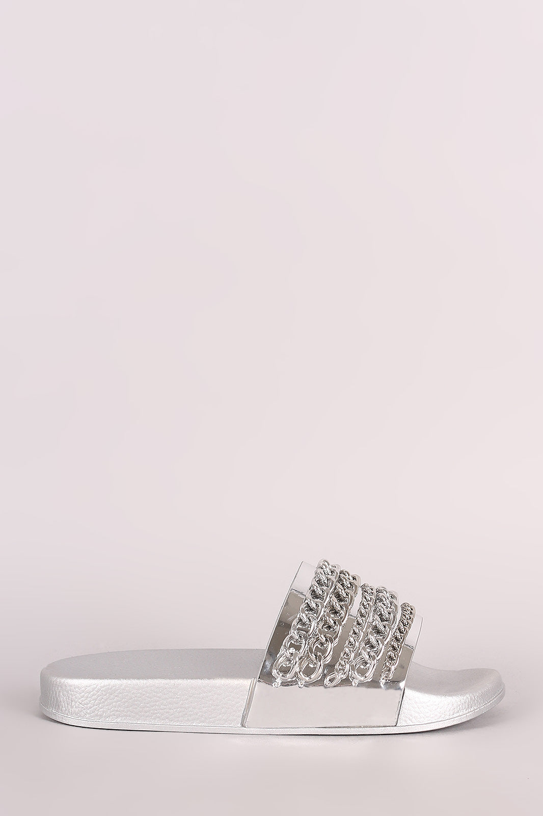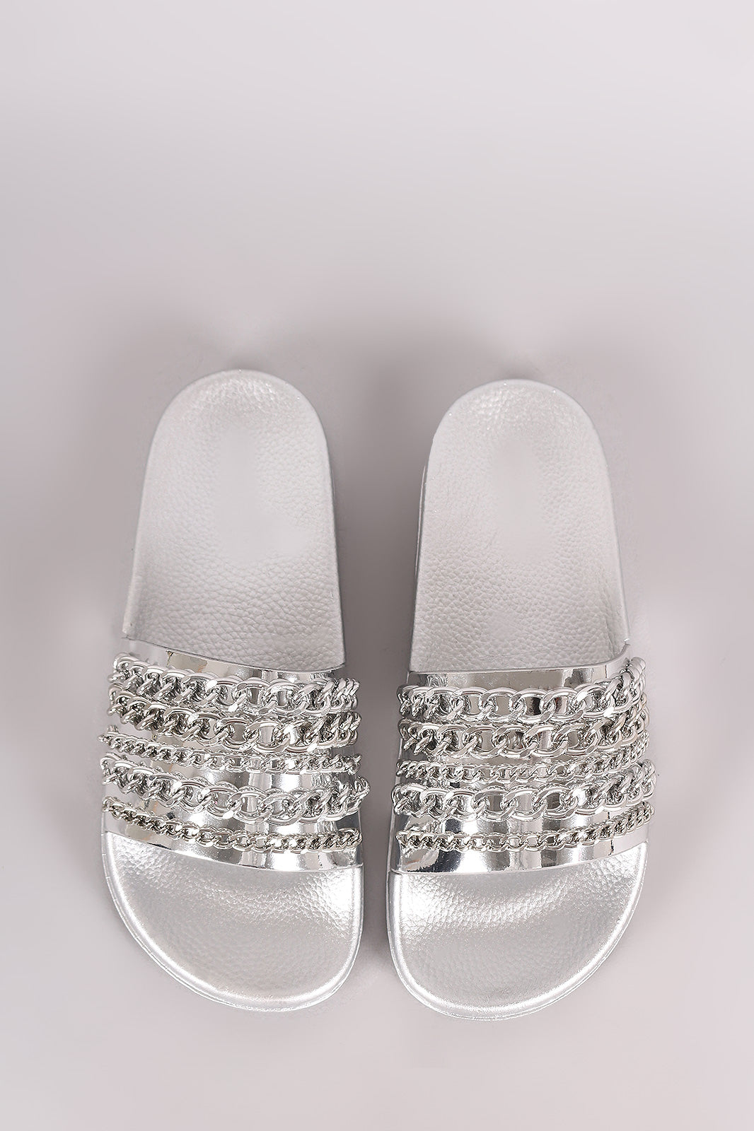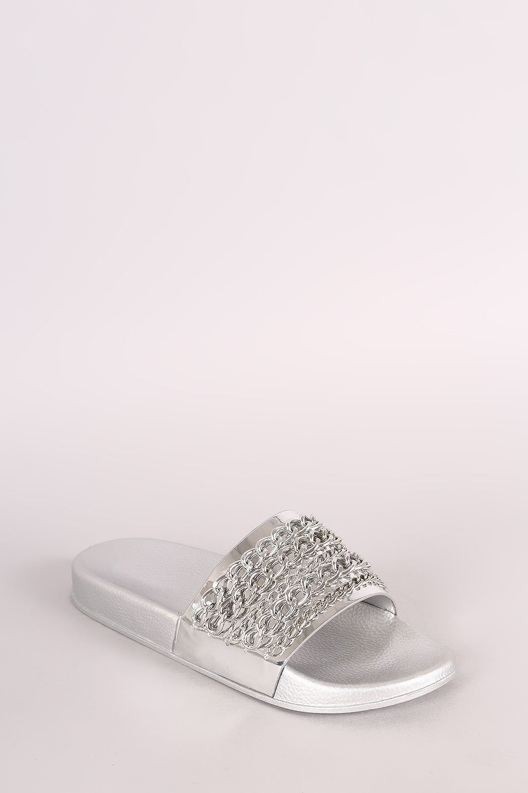 Bamboo Metallic Chain Embellished Open Toe Slide Sandal