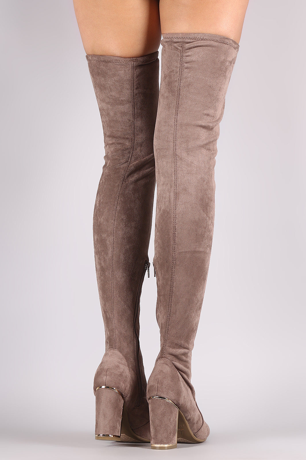 These fitted boots feature an over the knee style, a pointy toe silhouette, inner side zipper closure, a chunky heel with metallic accents, and a slightly cushioned insole.