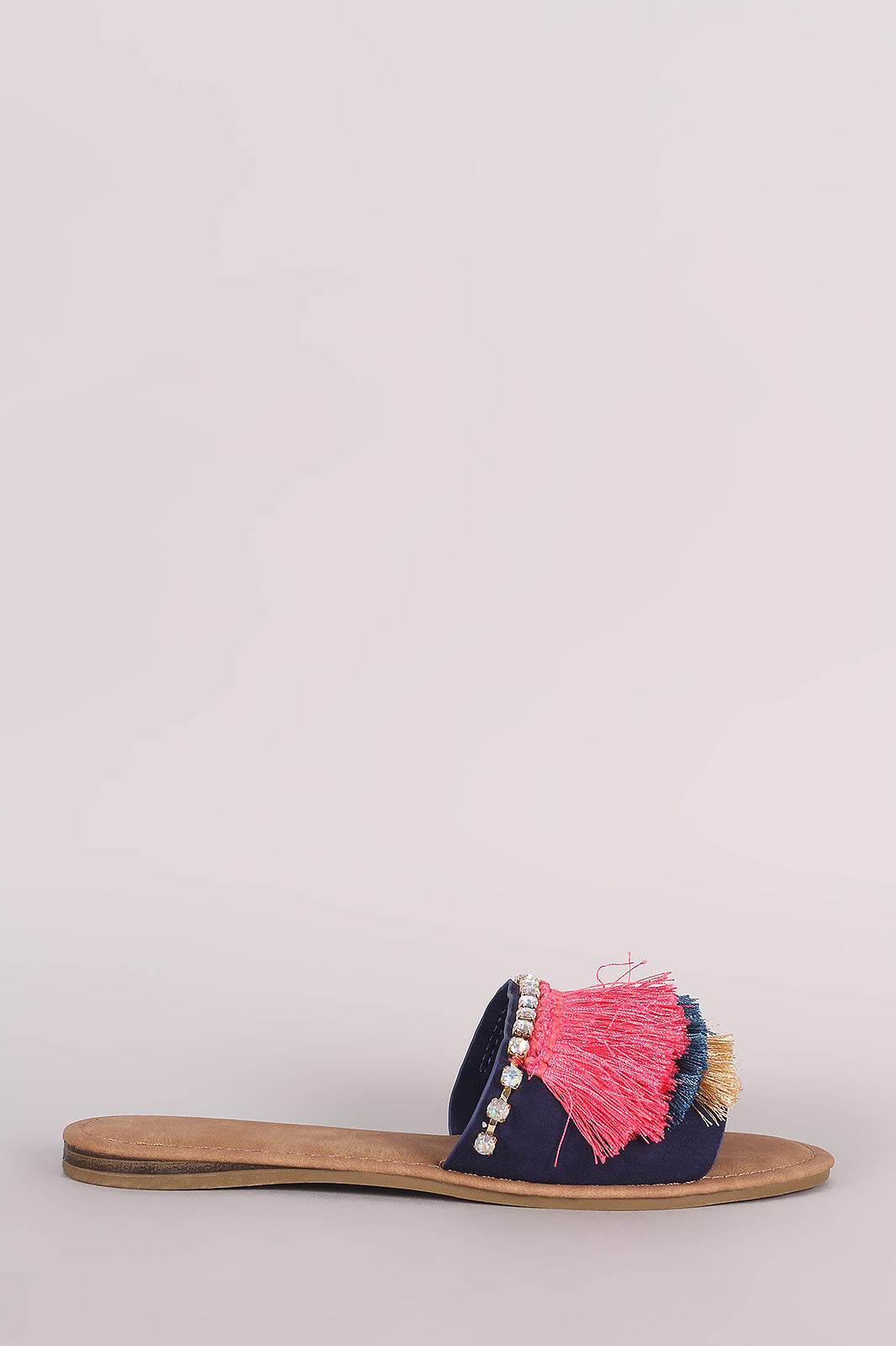 Bamboo Suede Tiered Fringe Rhinestone Slide Sandal