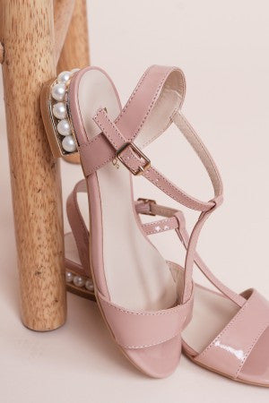 Bamboo Patent T-Strap Faux Pearl Heel Sandal