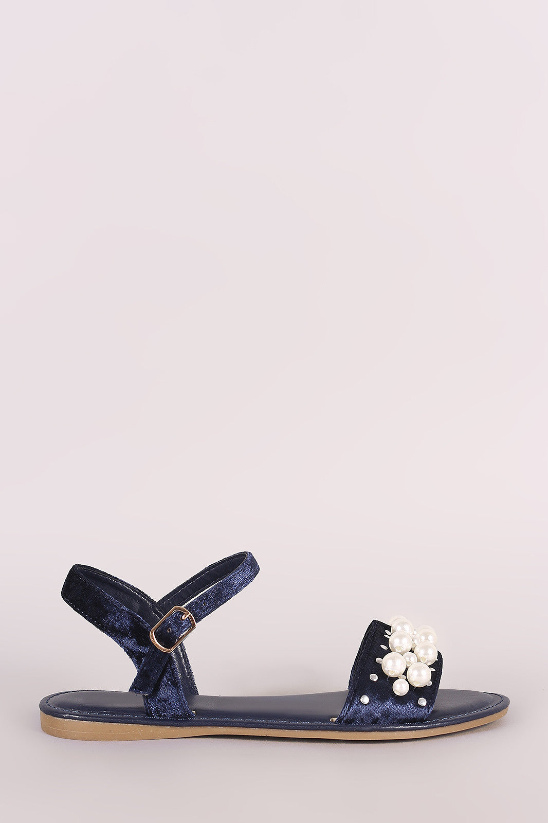 Bamboo Velvet Faux Pearl Accent Ankle Strap Flat Sandal