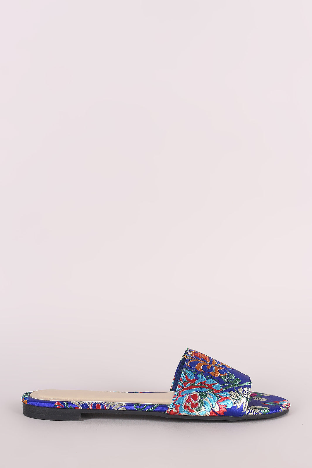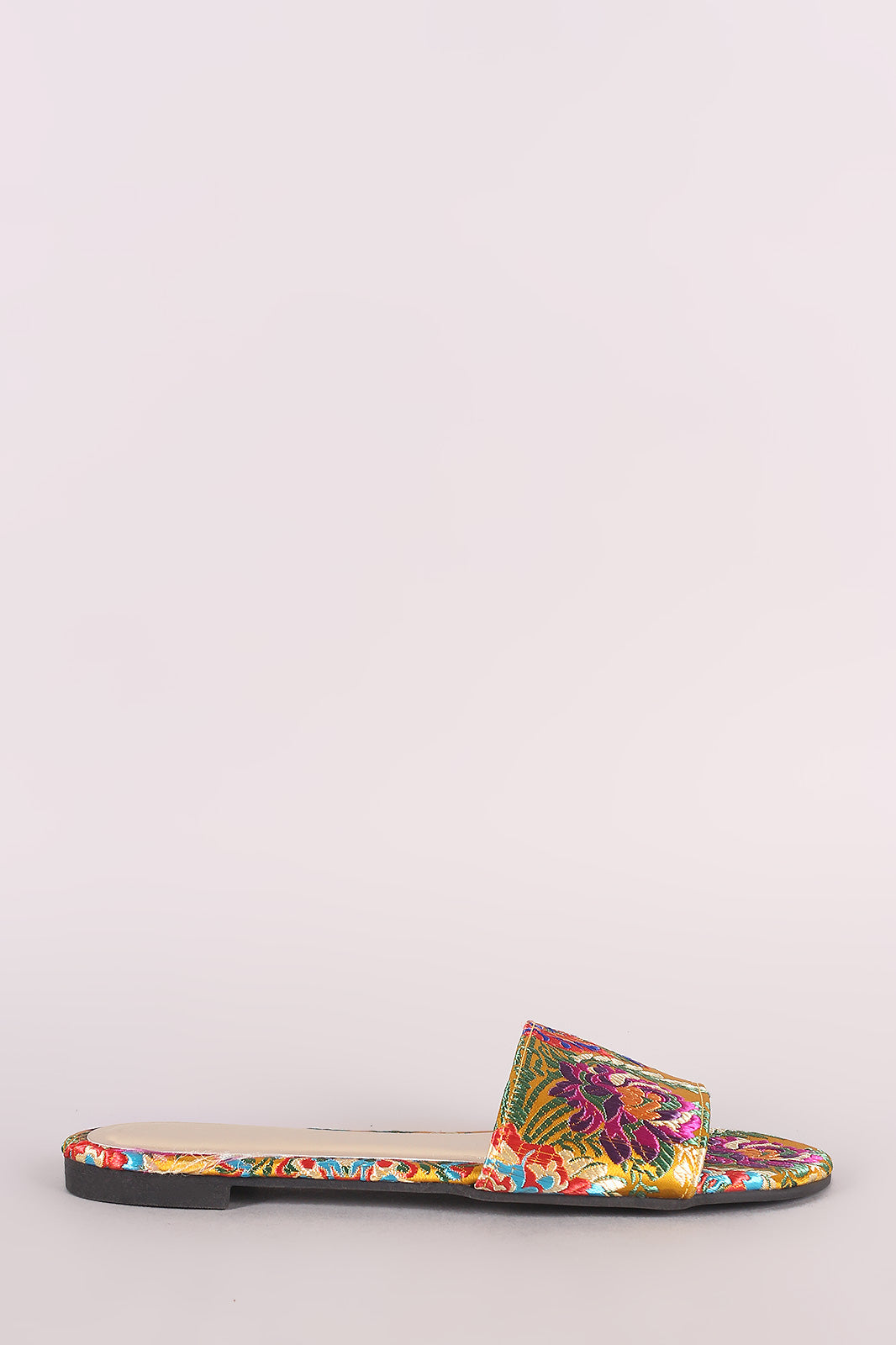 Bamboo Satin Floral Brocade Open Toe Slip-On Flat Sandal