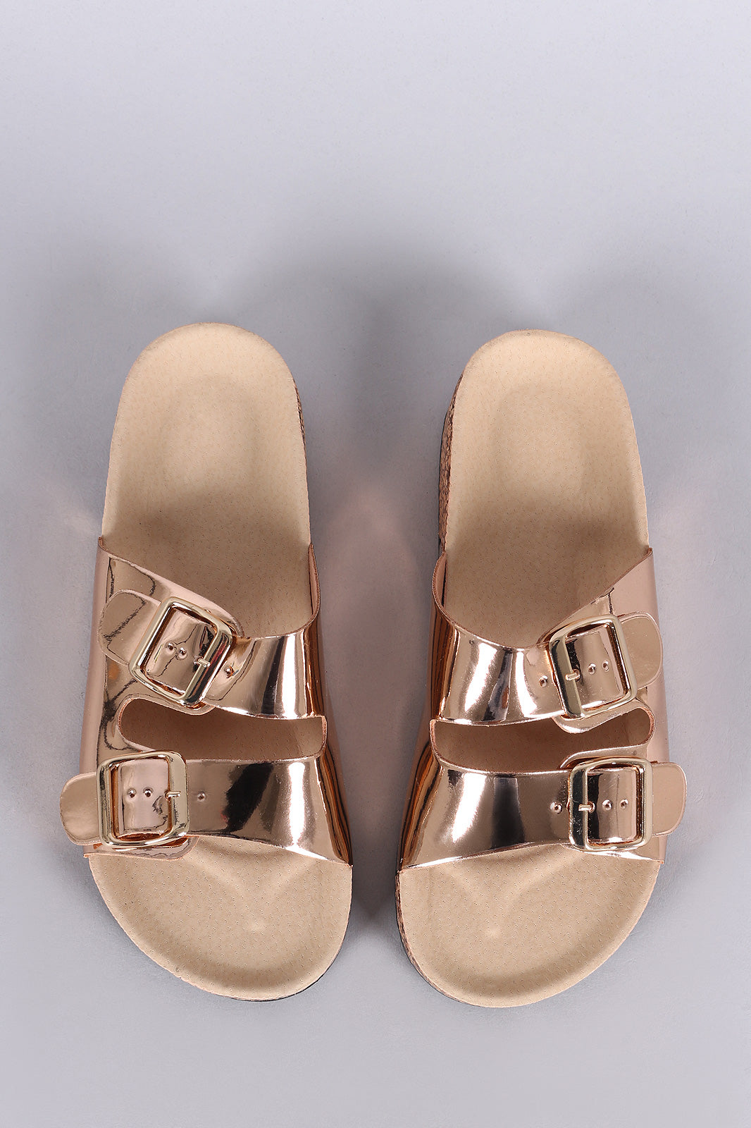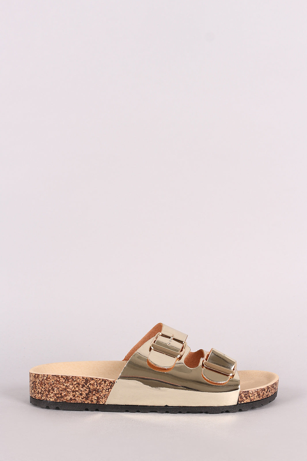 Bamboo Metallic Patent Open Toe Buckled Cork Slide Sandal