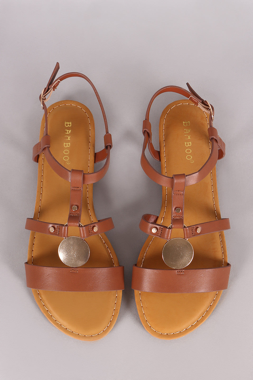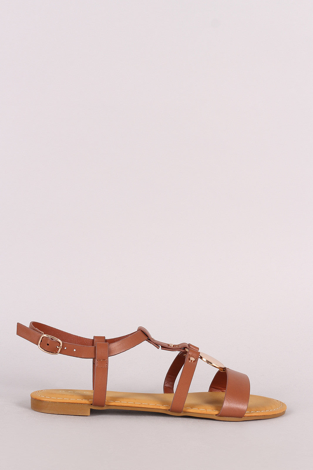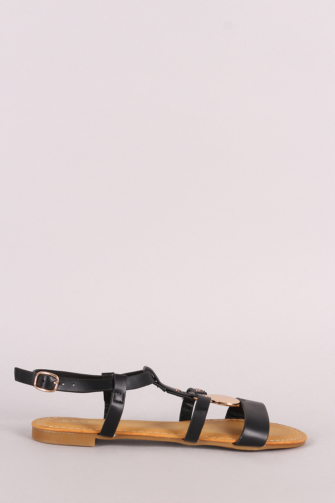 Bamboo Leather Strappy Caged Circular Plate Flat Sandal