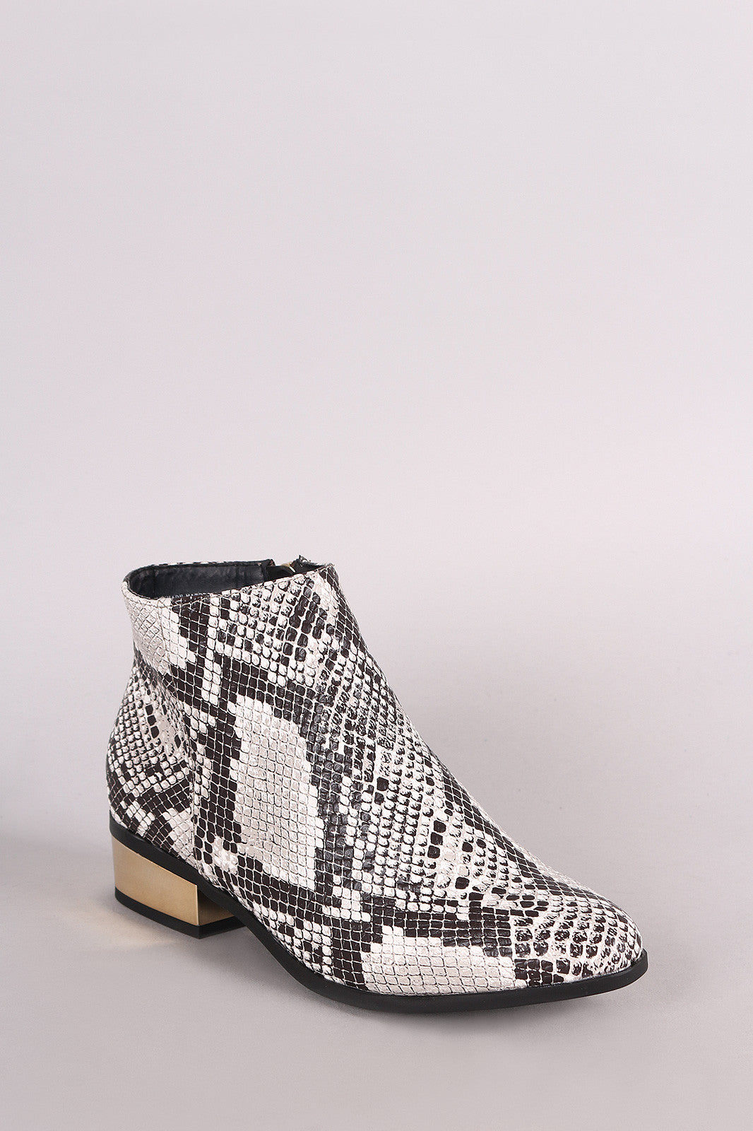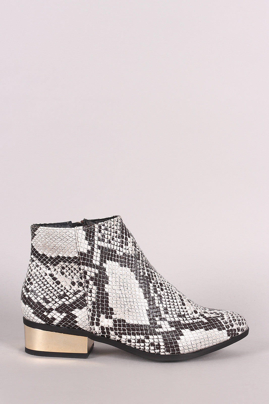 These ankle boots feature a snakeskin vegan leather, metallic block heel, almond toe silhouette, lightly cushioned insole, and a side zipper closure.