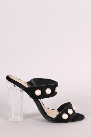 These stunning heels feature an open toe silhouette, double vamp straps with faux pearl accents, and cylindrical clear heel. Finished with a lightly padded insole and easy slide style.