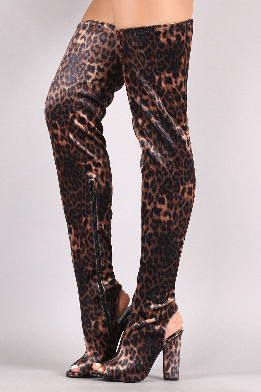 Bamboo Leopard Velvet Peep Toe Chunky Heeled Over-The-Knee Boots