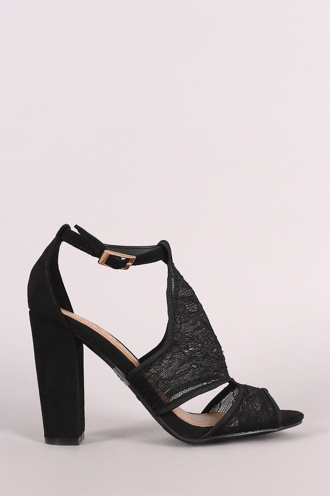 These fashionable heels feature a lace design with vegan suede, peep toe silhouette, cutout design at sides, and chunky wrapped heel. Finished with a lightly cushioned insole, enclosed heel counter, and ankle strap with adjustable buckle fastening.