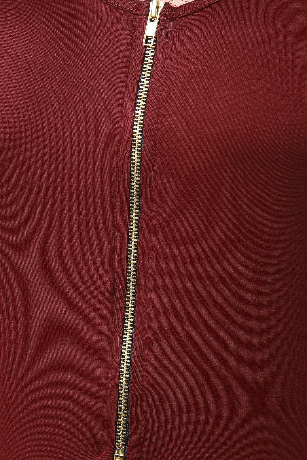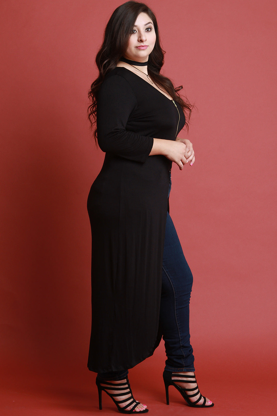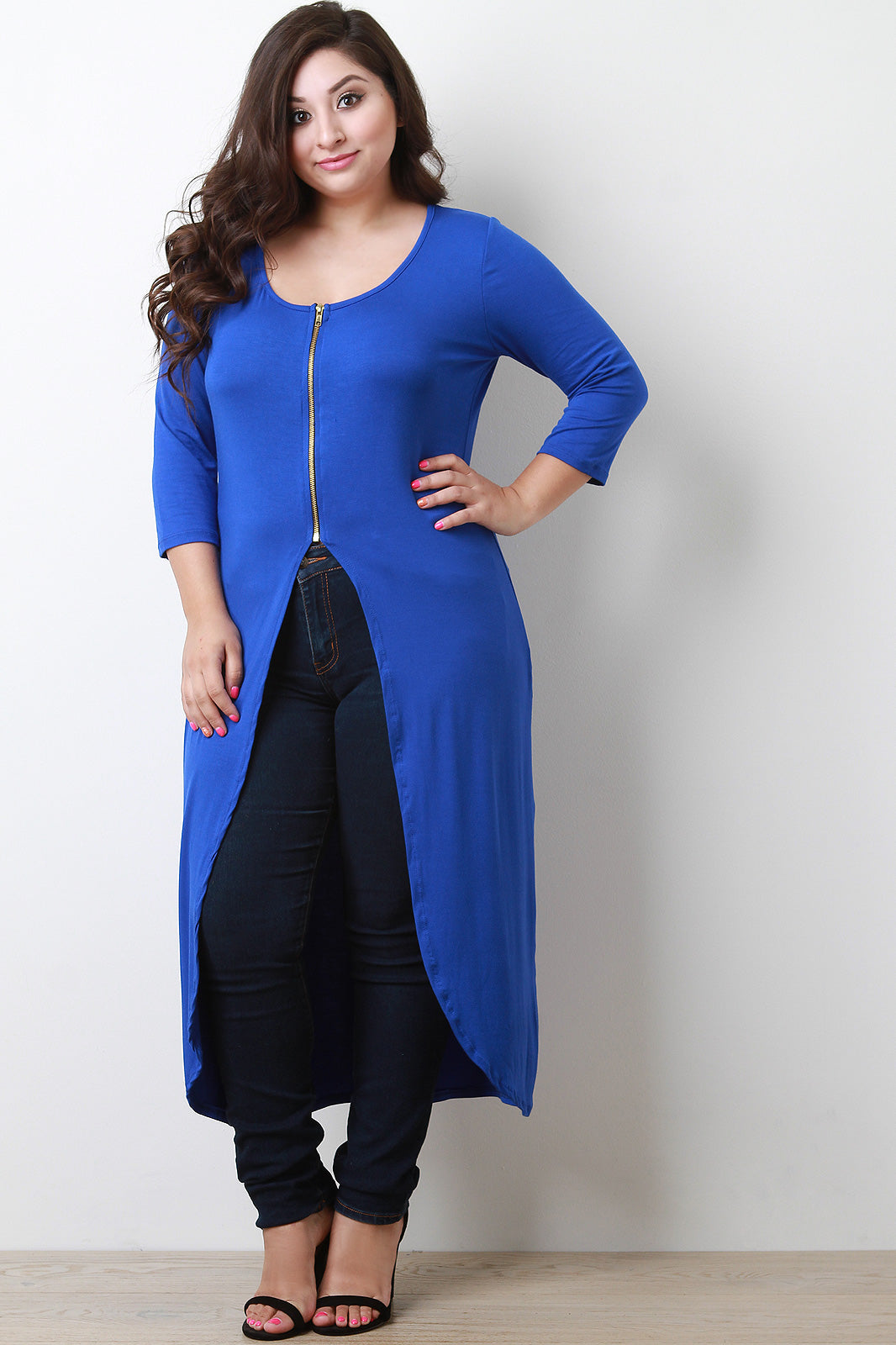 This casual plus size top features a soft jersey knit fabrication, round neckline, three-quarter sleeves, and zip-up front detail. Finished with a high-low maxi-length hemline. Made in U.S.A. 95% Rayon, 5% Spandex.