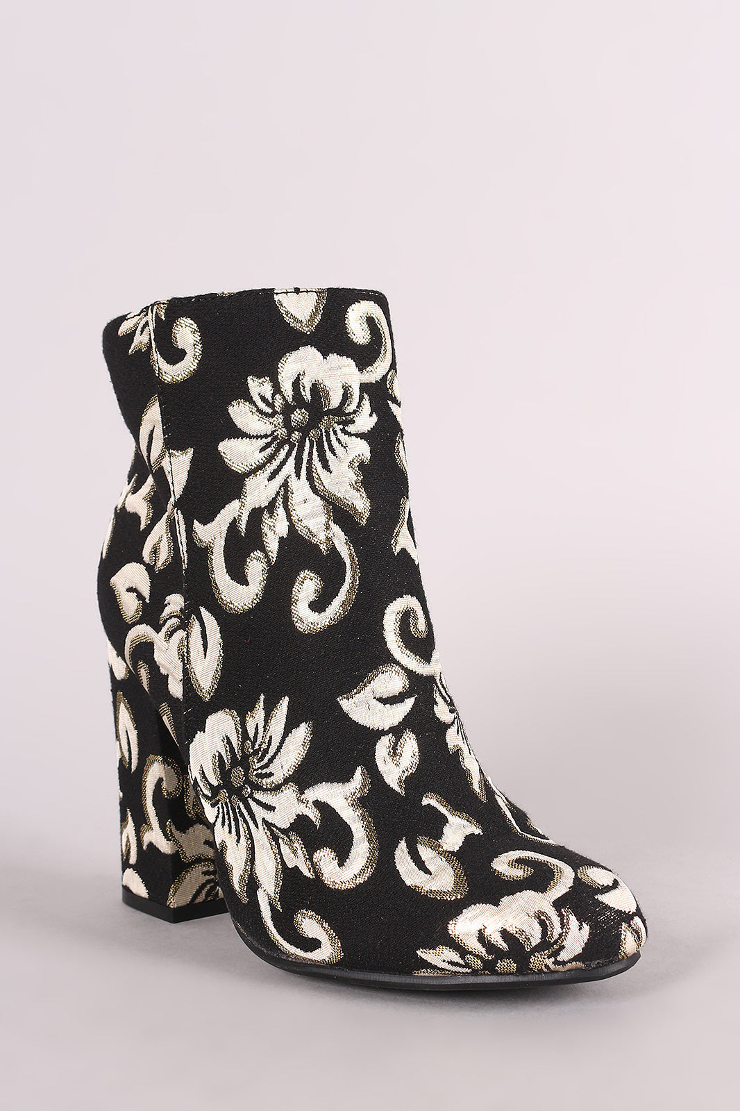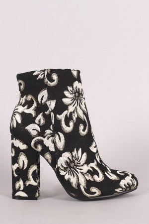 Bamboo Two Tone Floral Accent Chunky Heeled Booties