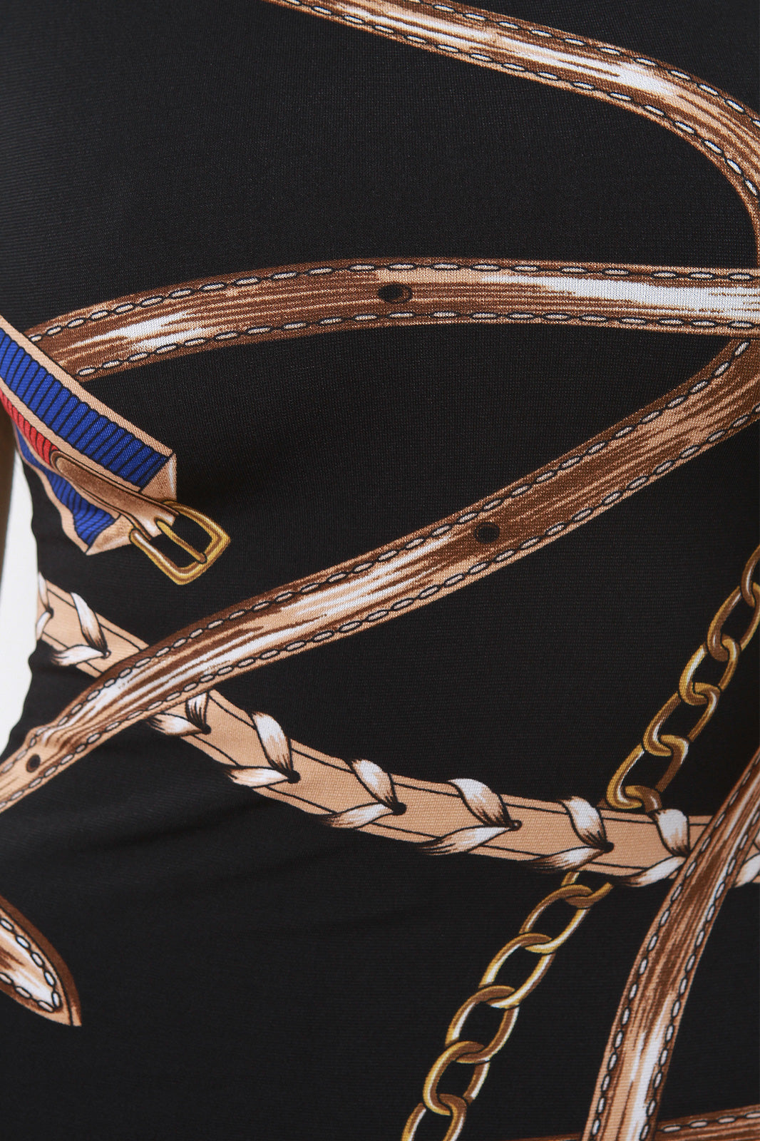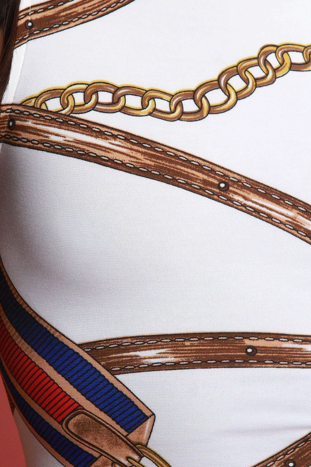 This dress features a chain print on stretchy fabrication, round neckline, sleeveless construction, midi length hemline, and a fitted silhouette. Accessories sold separately. Made in U.S.A. 95% Polyester, 5% Spandex.