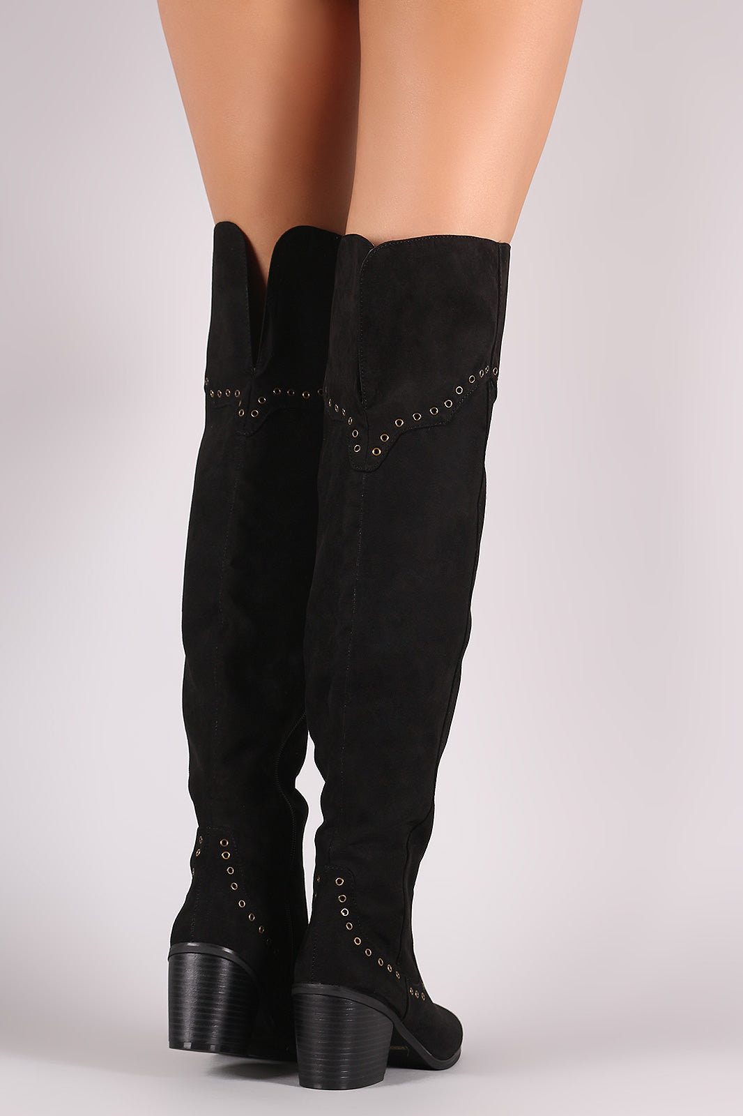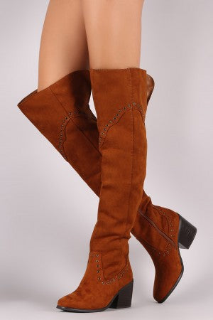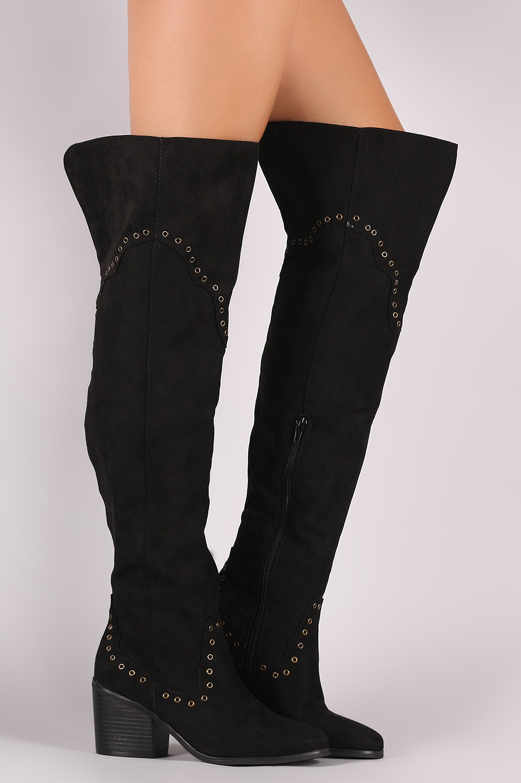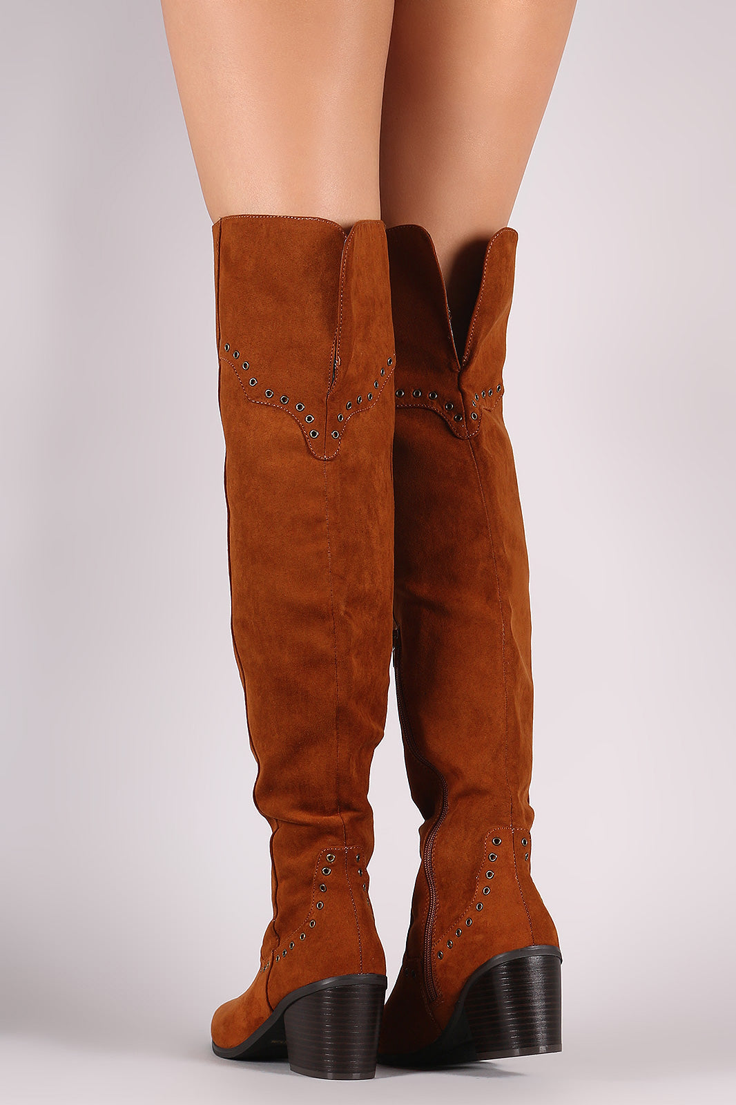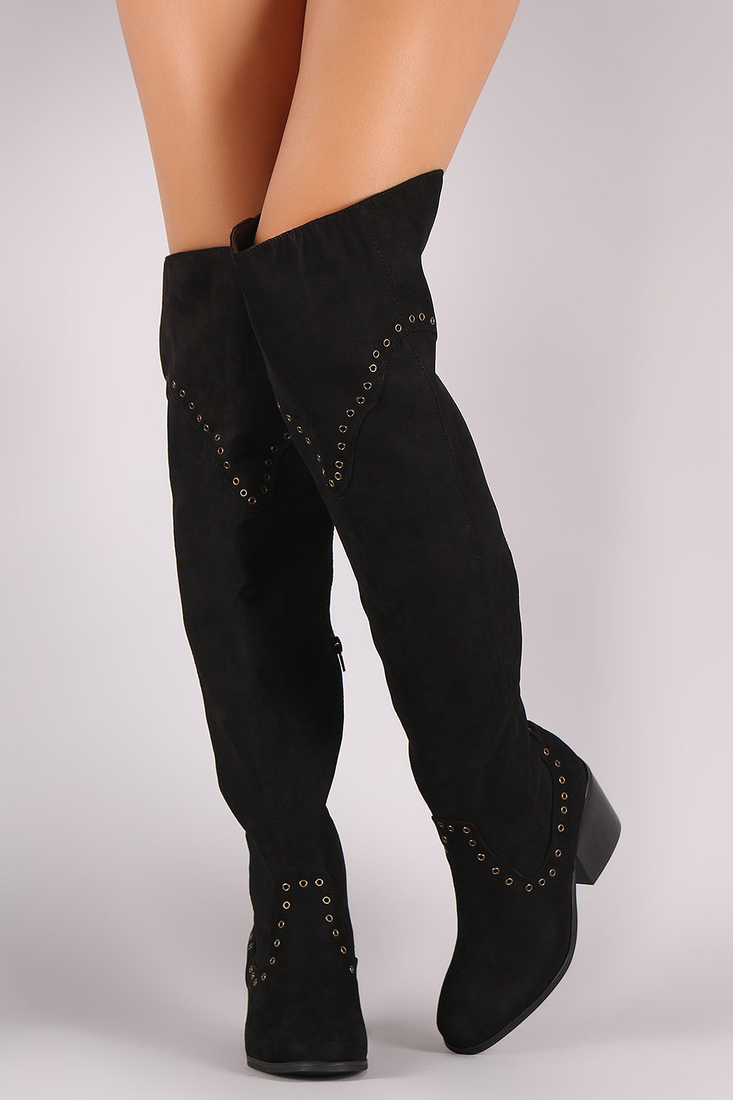 These boots have a western style with grommet accents along the stitching details, almond toe, and chunky heel. Faux fur lining and over-the-knee panel is vegan leather. Mid shaft inner side adjustable zipper.