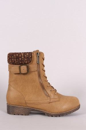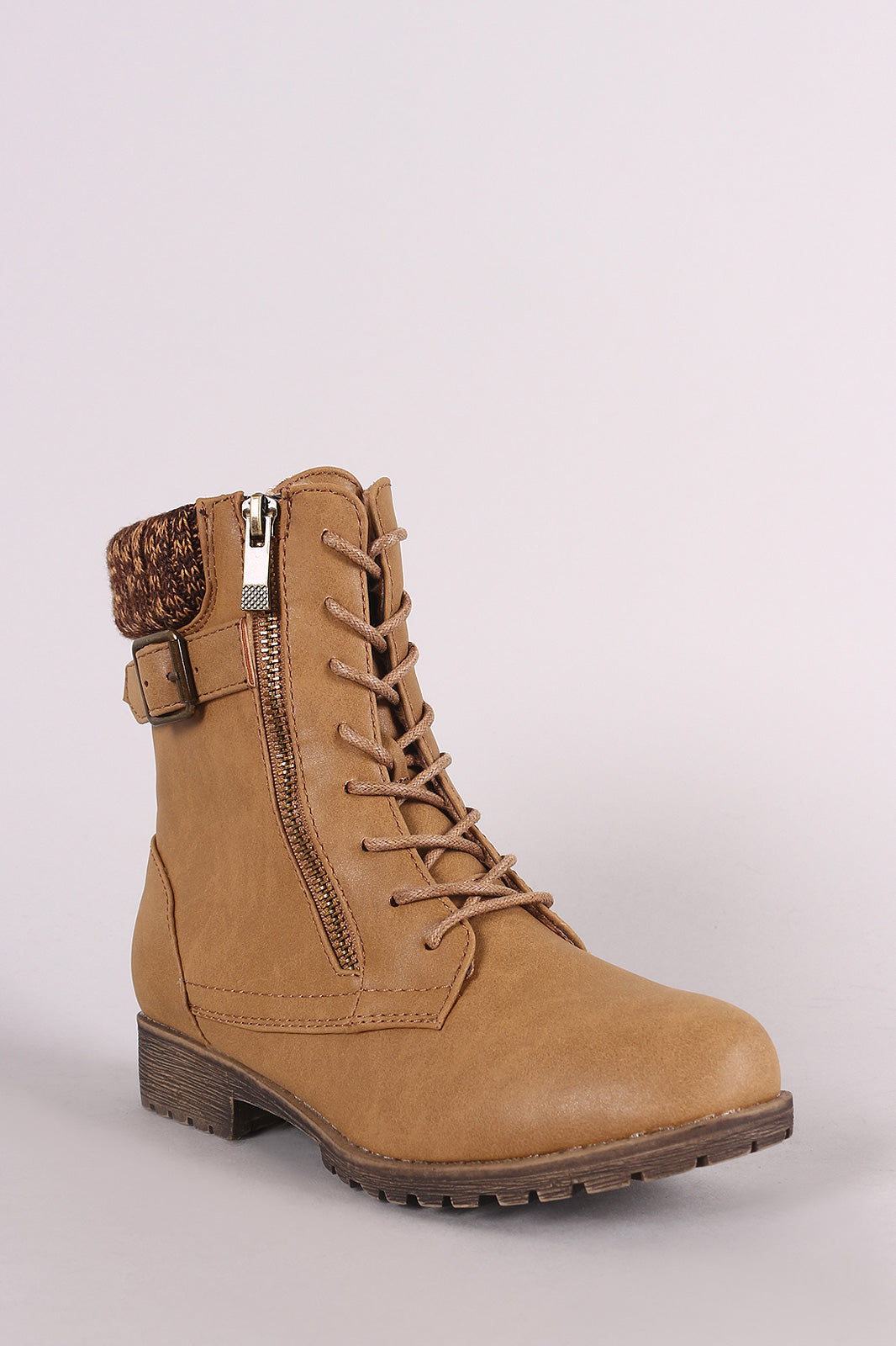 Bamboo Knit Cuff Buckle And Zipper Accent Combat Lace Up Boots