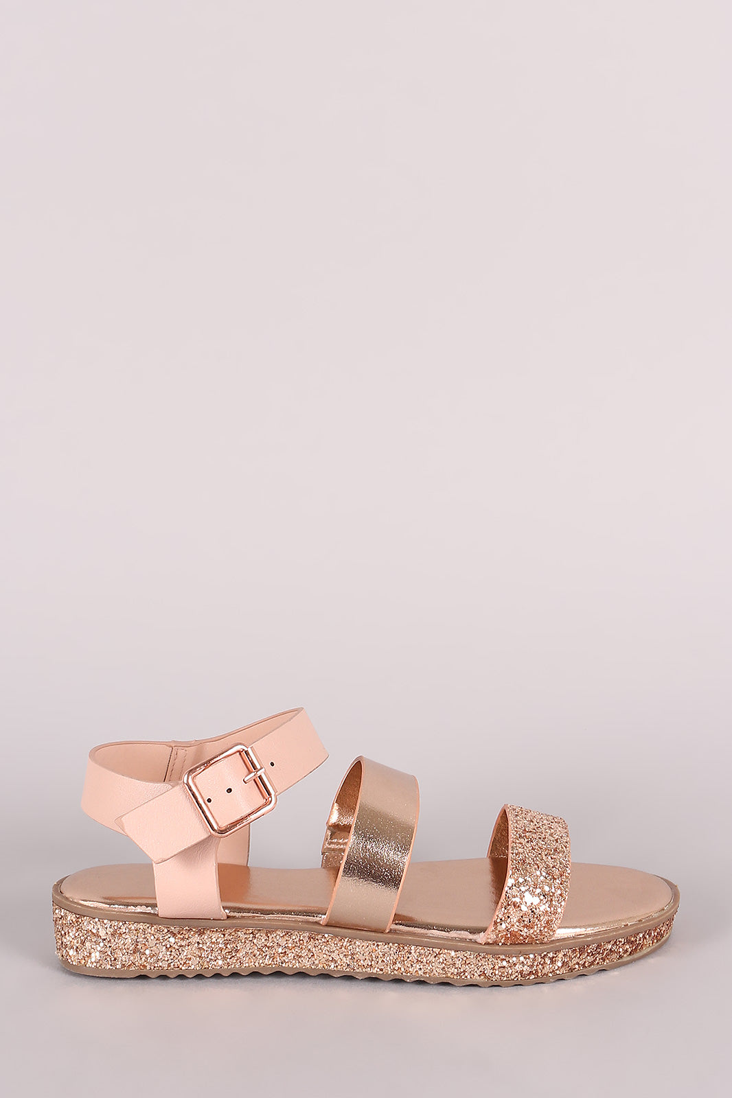 This chic flat sandal features an open toe silhouette, double band across vamp, sparkling glitter accents, and low flatform heel. Finished with a lightly padded insole and adjustable ankle strap with side buckle fastening.
