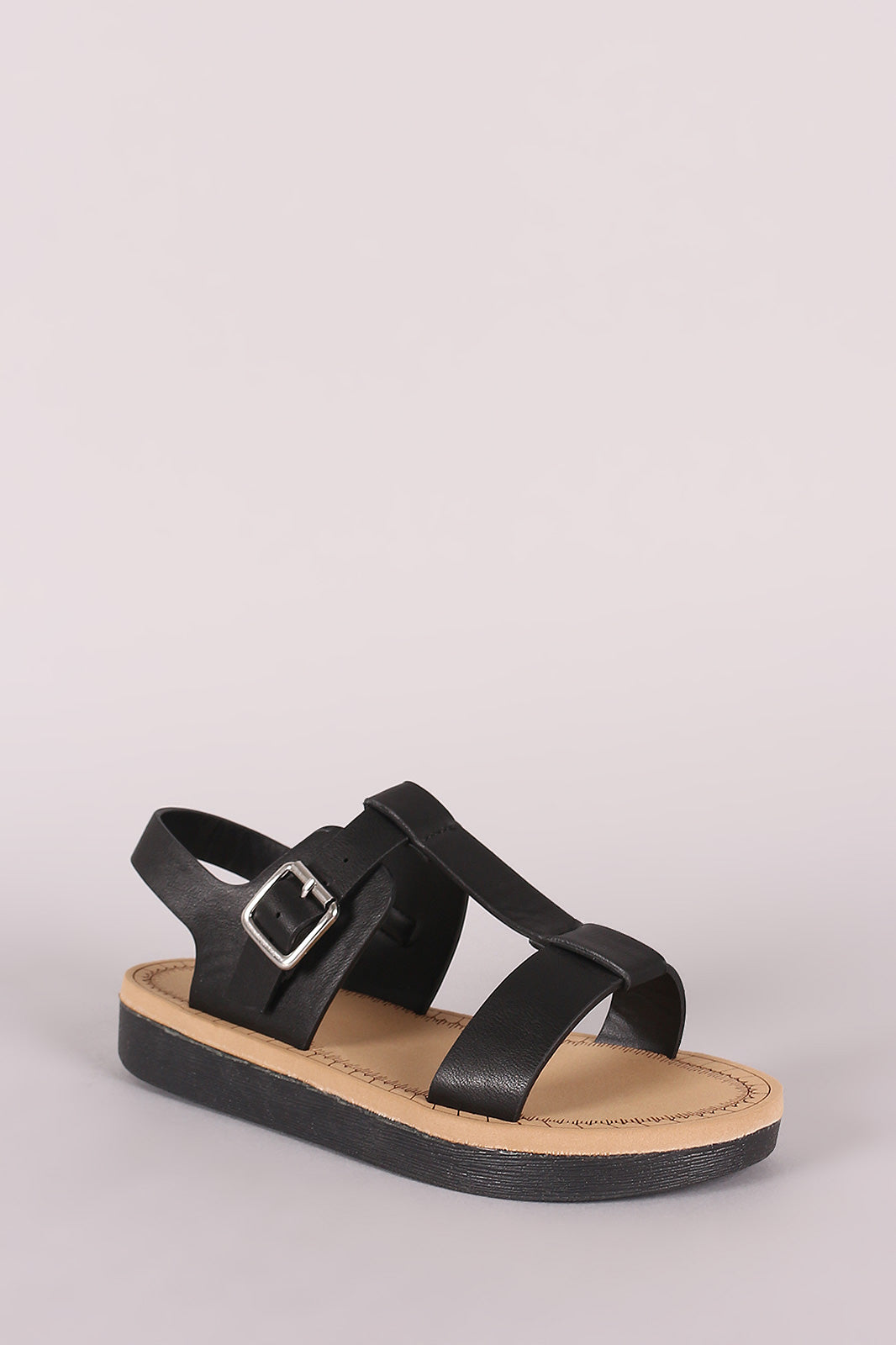 This flat sandal features an open toe silhouette, T-strap construction, and adjustable instep buckle strap closure. Finished with a flatform sole and lightly cushioned footbed for comfort.